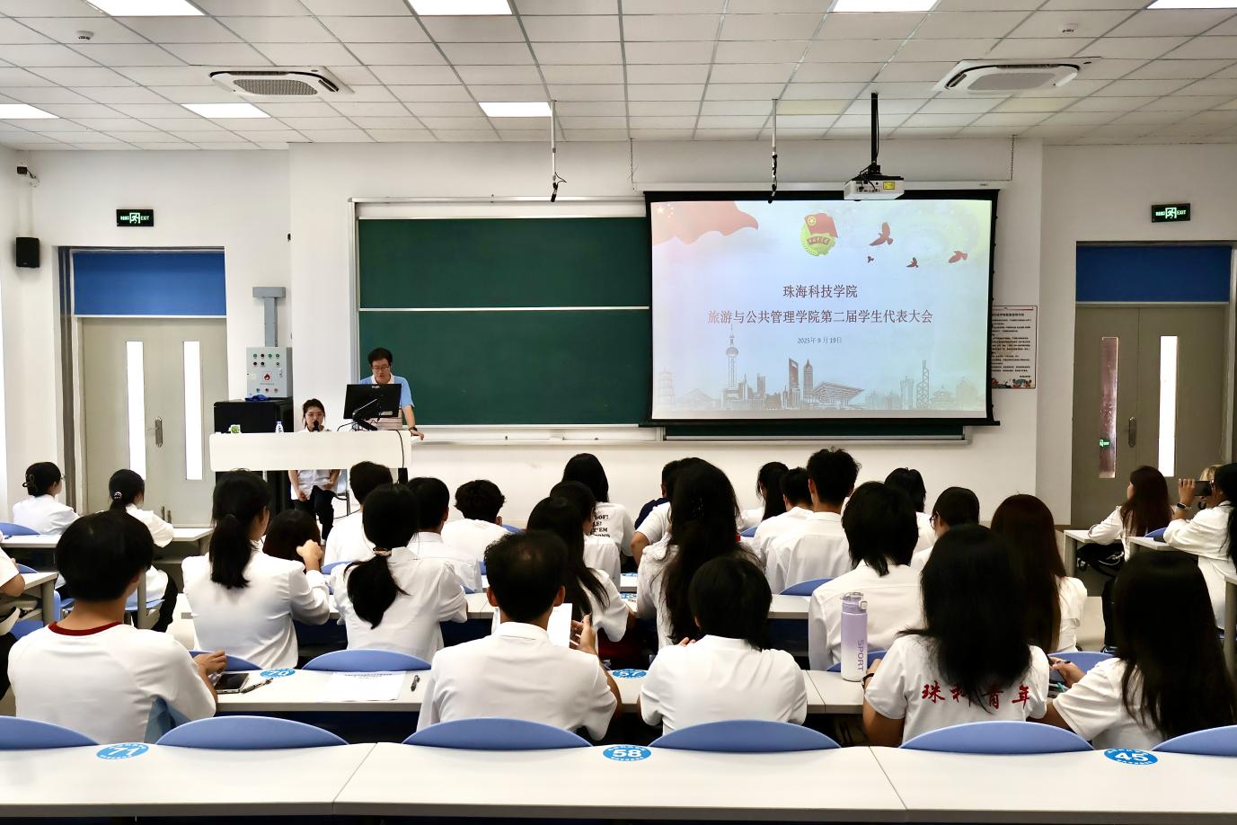 为全面贯彻落实党的二十大精神,努力践行习近平总书记对青年的殷切嘱托,进一步加强学院学生会组织建设,保障学生民主权利,2025年9月19日12:20,珠海科技学院旅游与公共管理学院第二次学生代表大会在国学院K101如期启幕。本次大会由邓昀老师主持,学院师生代表齐聚一堂,共商学生工作发展新篇。