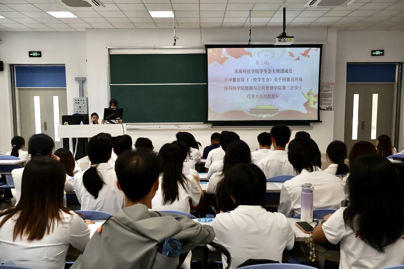 大会在庄严的国歌声中拉开帷幕。首先,旅游与公共管理学院党委副书记、学生工作办主任史垒正宣读《关于同意召开珠海科技学院旅游与公共管理学院第二次学生代表大会的批复》,为大会的合法合规召开提供了依据。随后,学生会主席团成员卓泽馨宣读《(校学生会)关于同意召开珠海科技学院旅游与公共管理学院第二次学生代表大会的批复》,展现了校院两级学生会组织的联动支持。