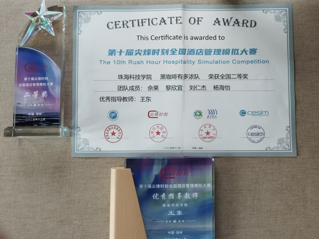 2025年12月7日,由中国旅游协会旅游教育分会、尖烽时刻组委会联合桂林旅游学院共同主办的第十届尖烽时刻全国酒店管理模拟大赛全国总决赛圆满落幕,珠海科技学院旅游与公共管理学院酒店管理专业组建的参赛团队,从全国近300支参赛队伍中脱颖而出,历经初赛在线模拟决策、复赛案例分析与决赛现场多环节比拼,最终荣获全国二等奖前列佳绩,王东教授作为指导教师荣获“优秀指导教师奖”,充分展现了珠海科技学院应用型人才培养的丰硕成果。