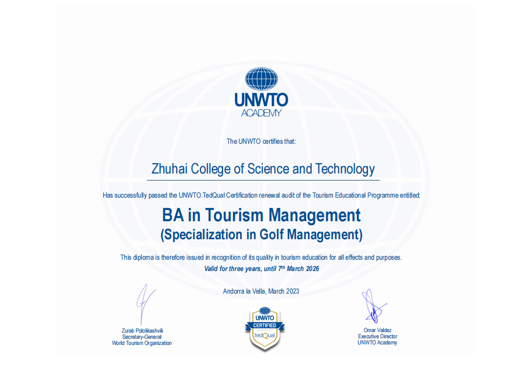 高尔夫管理专业方向隶属于旅游管理专业,为国家一流本科专业建设点,广东省一流本科专业建设点,高尔夫管理连续两轮通过联合国世界旅游组织(UNWTO)教育质量认证(TedQual),现为全国民办高校中唯一获此殊荣的高校。教学团队有教授1人,副教授5人,博士教师2人,骨干教师全部拥有高尔夫资格证书。建有占地27000平方米的高尔夫教学中心,有30个打位。历经15年实践,培养出13位国际高尔夫裁判,占全国总量的1/5,16位国家级裁判,成为全国培养高水平裁判最多的高校,被誉为“中国高尔夫裁判人才的黄埔军校”;还有职业球员黄秋波、国家高级教练王梦晗、8名国家初/中级教练、10名企业高管及5名高校教师,形成推动行业发展的“珠科力量”。
